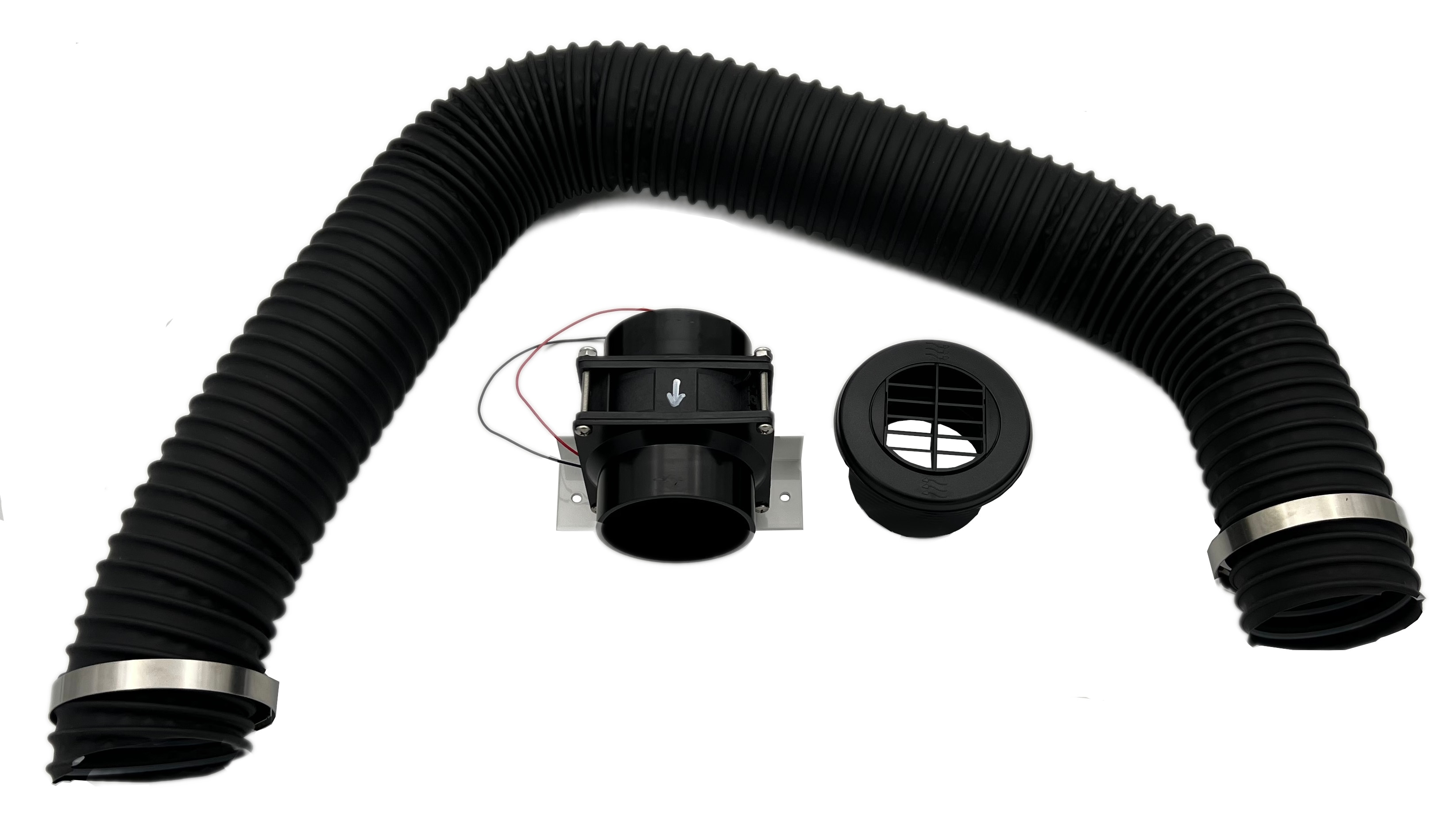 This kit comes with a powder coated aluminum mounting plate, fan with duct adapters, five feet of 3-inch duct and one 3-inch grillewith stainless clamps.