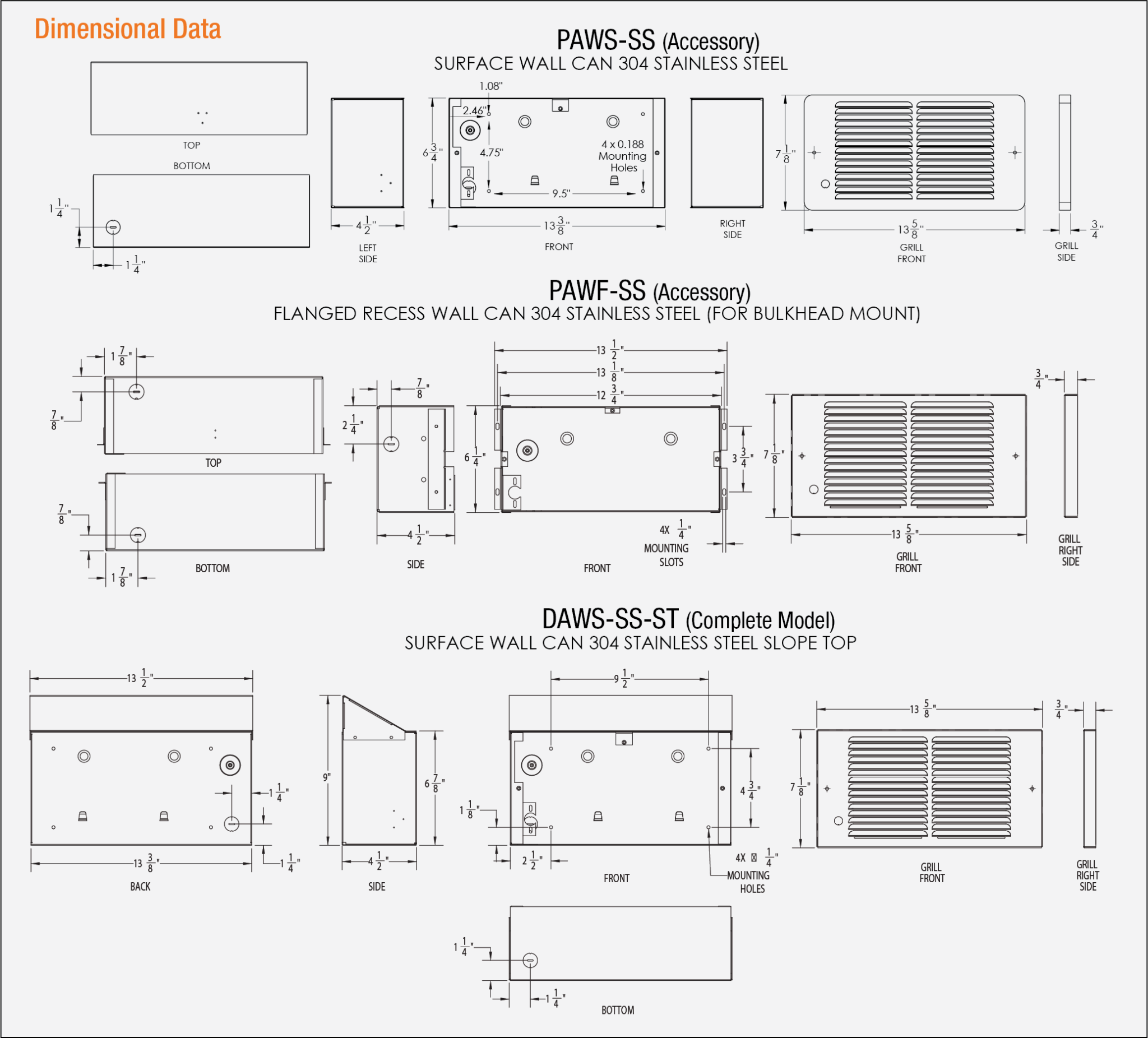 Engineering SpecsContractor shall supply and install, DAW Stainless Steel Series wall mounted forced-air electric heaters manufactured by King Electrical Mfg.Company, of the wattage and voltage as indicated on the plans. Ratings: Heaters shall be available in wattages of 250 to 2,250 at 120,208, or 240 Volts. Blower and Motor: A tangential cylindrical blower, delivering 65 CFM,shall be driven by a shaded pole, permanently lubricated, C-frame typemotor with impedance protection and sealed bearings. Motors shall bethe same voltage as the heater. Elements: Element assemblies shall consist of steel sheathed heatingtubes in a furnace brazed, plate-finned, block design. Each sheathedtube shall contain coiled a Ni-Chrome wire embedded in an insulatorof Magnesium Oxide. Thermal Overload: Heaters shall be equipped with thermal overloadSmart Limit Protection®, which disconnects elements and motor in theevent normal operating temperatures are exceeded. If thermal overloadtrips due to abnormal operating temperatures, thermal overload shallremain open until manually reset by turning the heater off for fifteenminutes. Automatic reset of thermal overloads,which allow the elementto continue to cycle under abnormal conditions, will not be accepted. Wall Can: The wall can shall be stainless steel and shall contain aminimum of three (3) knockouts. The wall can shall have a depth gaugeor flange mount, and a factory installed Copper groundwire. Minimum4” clearance to floors and 6”to sidewalls. Zero clearance to combustiblesin the wall. Grill: 304 brushed stainless steel, clear powder coating. Selector Switch: Shall provide up to 7 wattage settings adjustable from switch on front of heater. Indicator: Light designates heater is operating. Approval: Heaters shall be listed and approved by UL or equal.